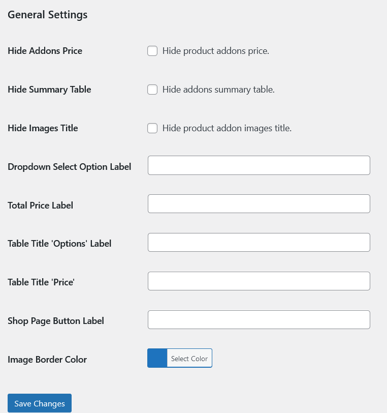 All labels and titles belongs to Product add-ons are localized and editable and their options are also added in the general settings along with a single color field for the border of the add-on type image.