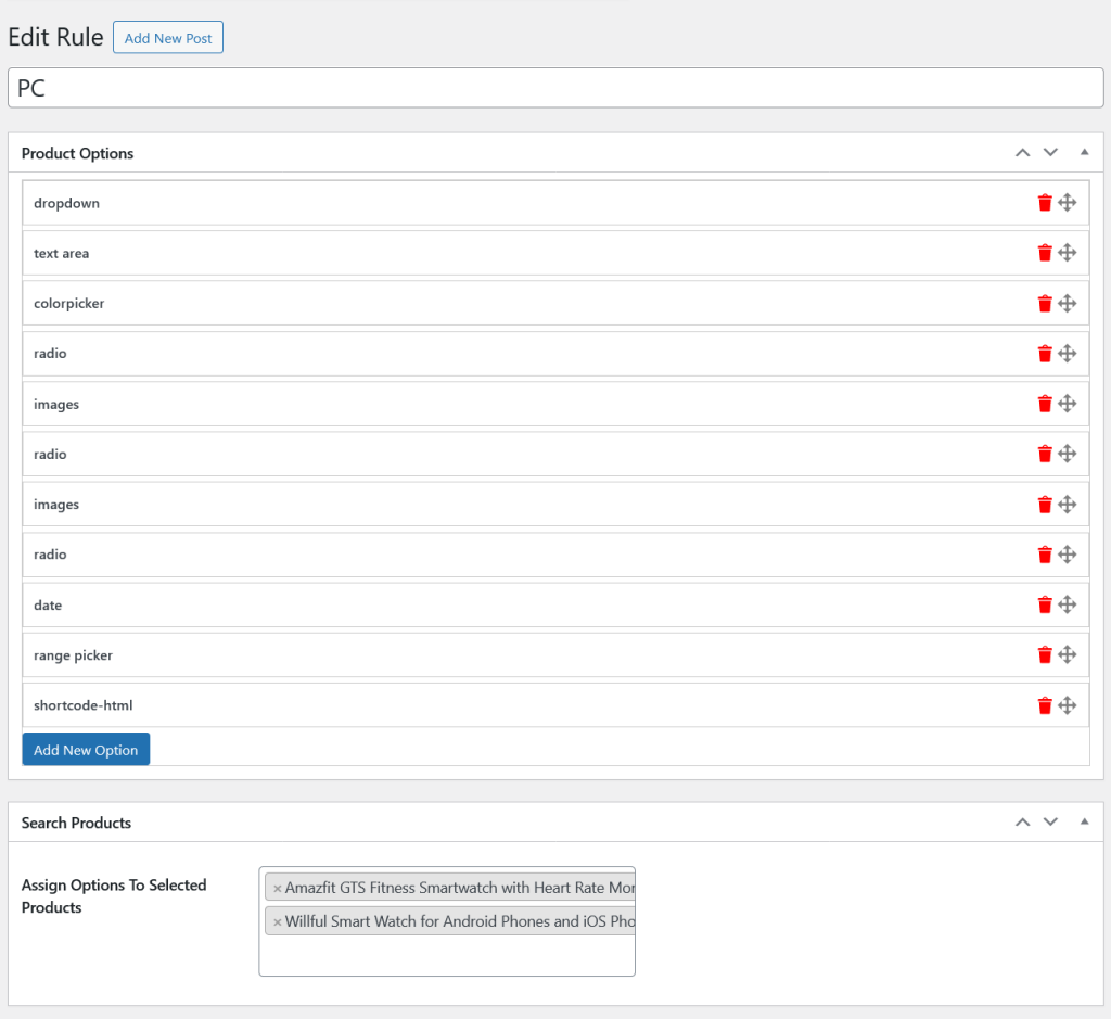 List of add-ons with drag and drop, delete options. Also there is an options to assign these add-ons to the specific products. We can assign these add-ons to the products at the product level also.