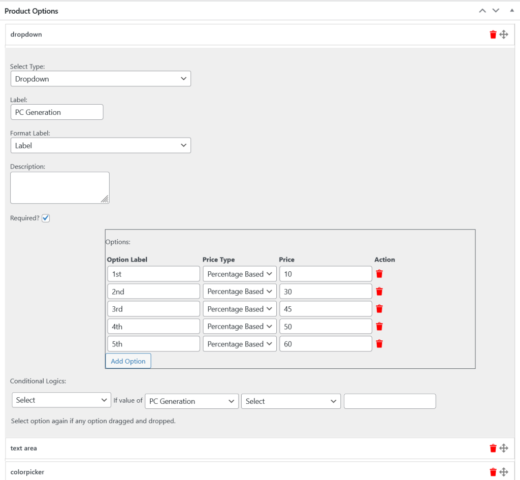 WooCommerce Product Add-ons support conditional logic also which means any add-on will be dependent on another add-on value. There are four specific fields for the conditional logic.